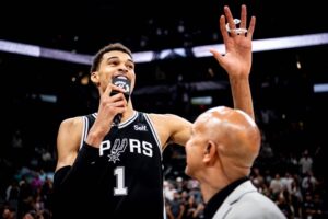 há 2 anosVictor Wembanyama comemora vitórias do Spurs no fim da temporada Pivô é o virtual vencedor do prêmio de melhor calouro
